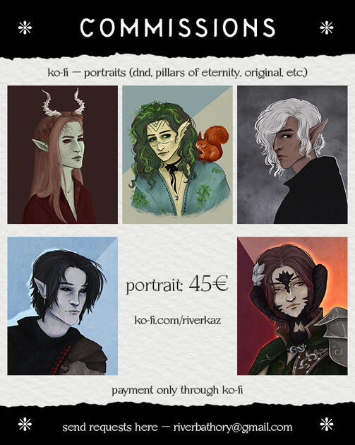 - payment is up front through ko-fi. after you secure a slot (and i confirm that you do have the slot) we talk through the details and i will try to provide a simple sketch first. after that is approved by you i will request full payment through ko-fi and start working on the actual commission.