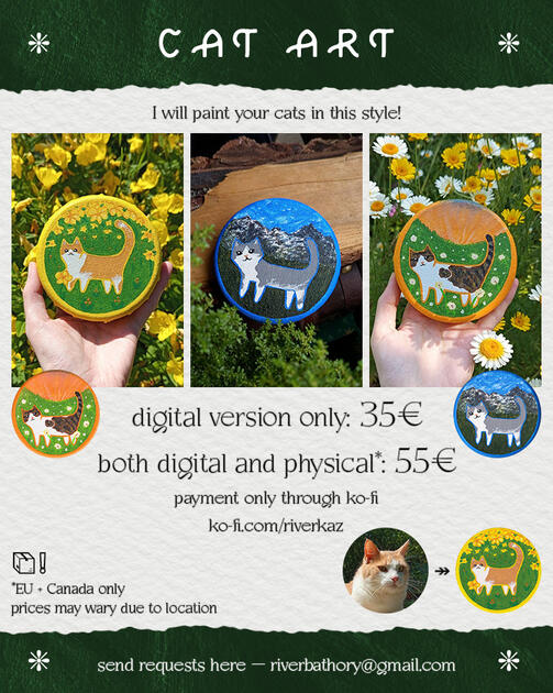 - i could possibly paint a small pet, as seen on the 2nd example, it will come with additional 15€, either way we can discuss the possibilities, don't hesitate to ask 🐻